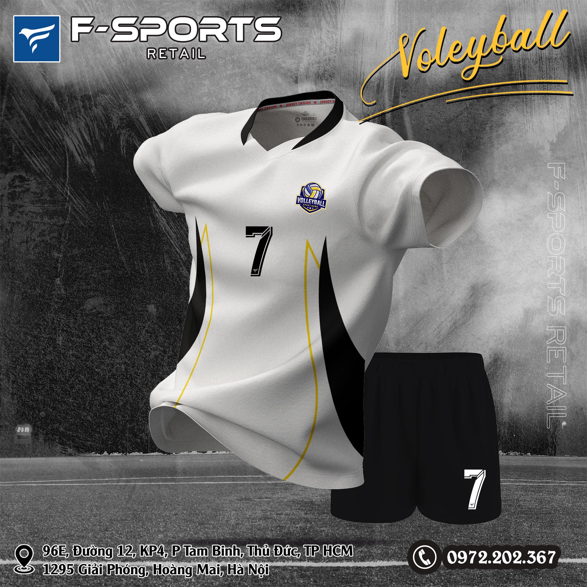 Thiết kế thể thao trẻ trung với màu trắng chủ đạo, phối đen – vàng nổi bật, cùng chất liệu vải thoáng mát, áo bóng chuyền FSports là lựa chọn hoàn hảo cho mọi trận đấu cường độ cao.